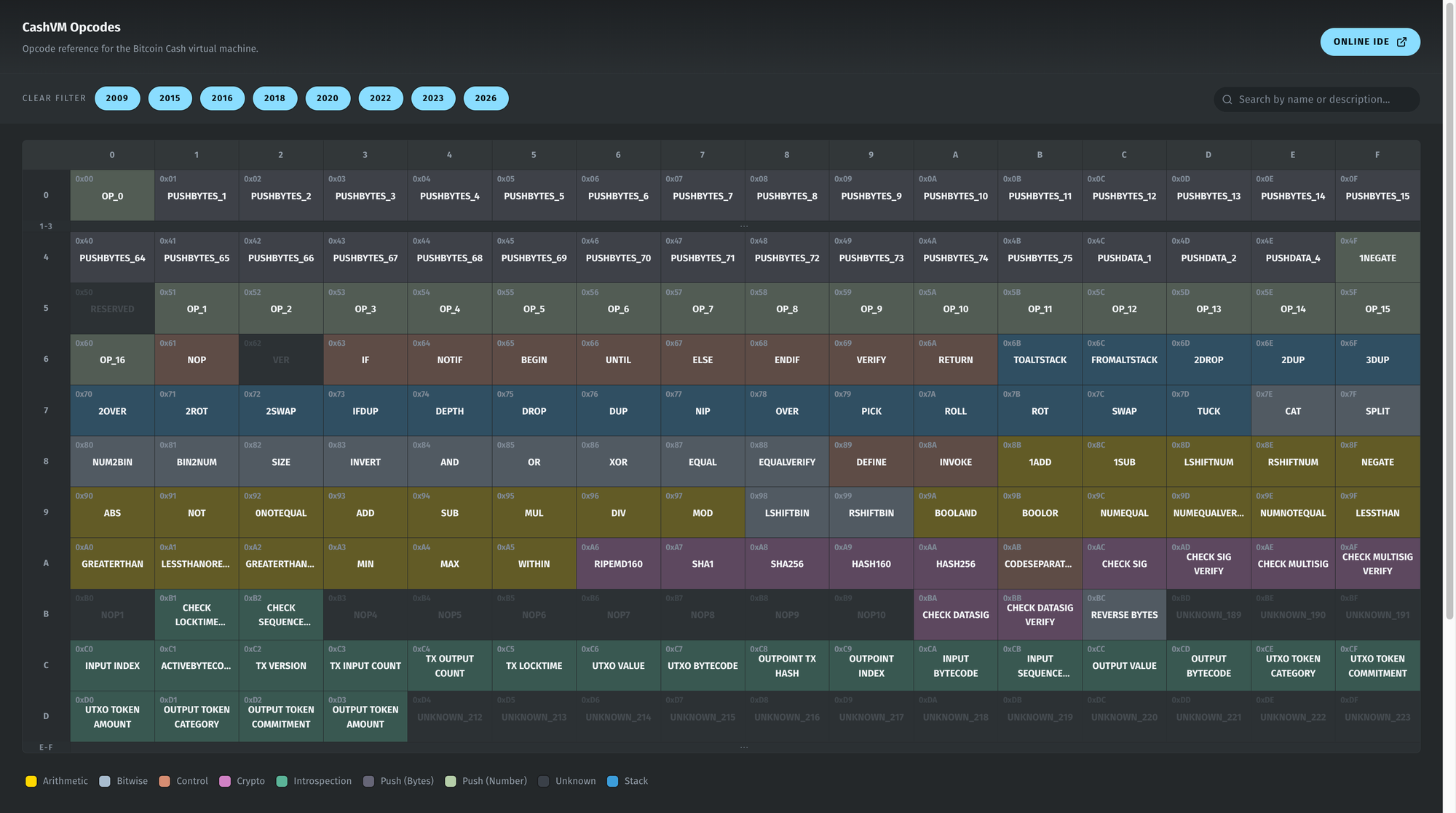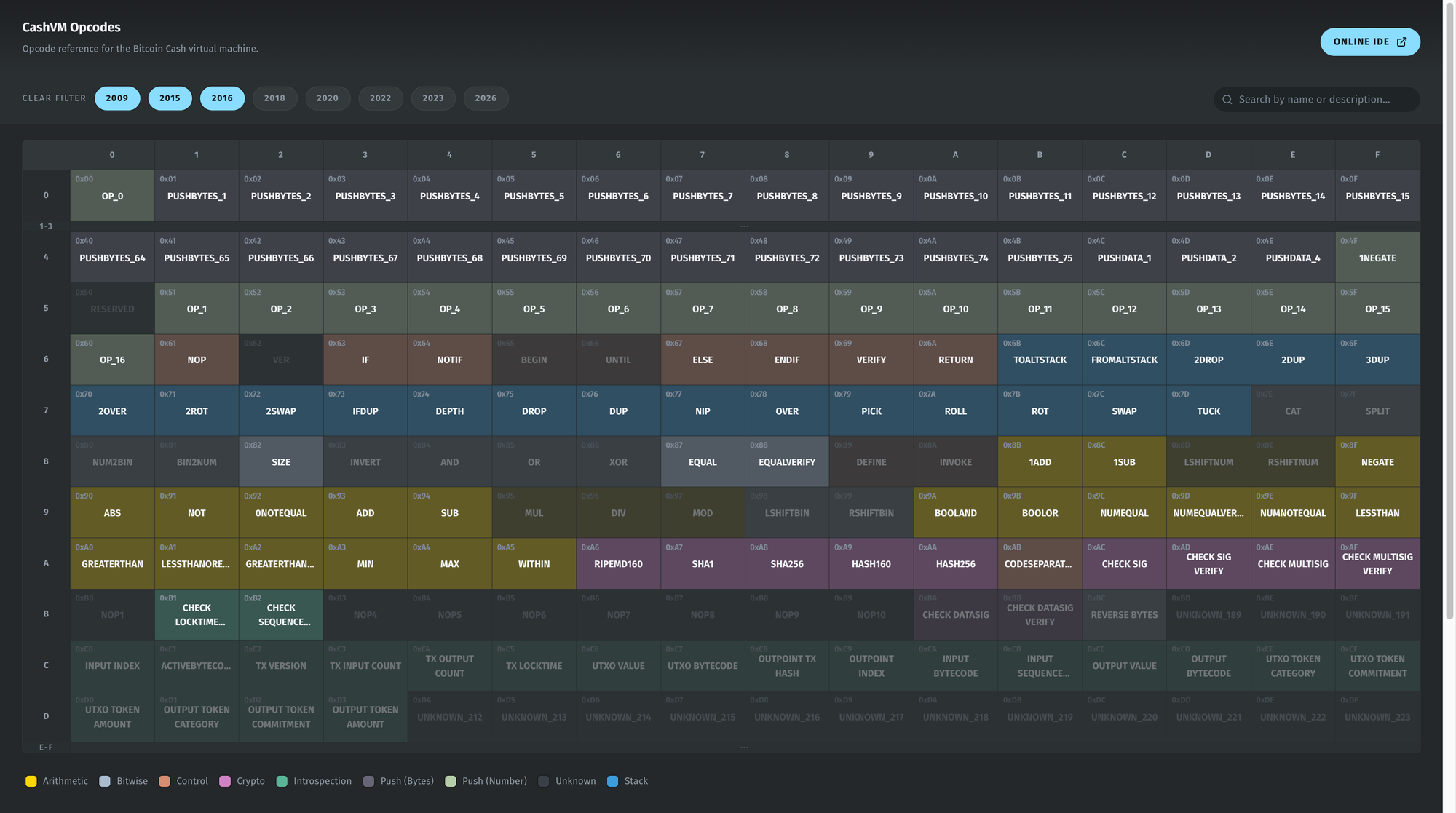 Left: Bitcoin Cash's VM opcodes as of 2016. Right: Bitcoin Cash's VM opcode as of 2026. Source: vm.cash.