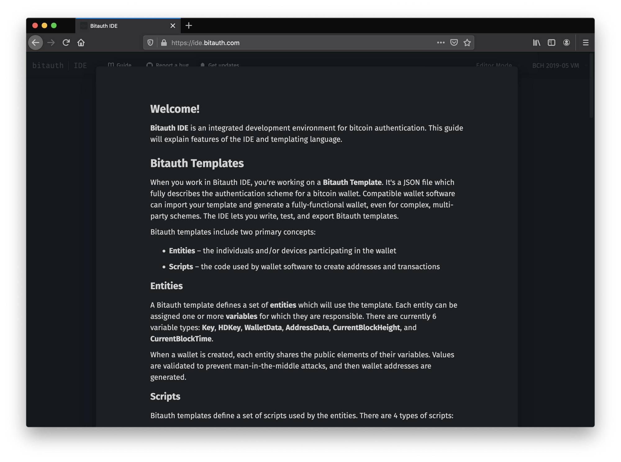 Bitauth IDE is an integrated development environment for bitcoin authentication. This guide will explain features of the IDE and templating language.