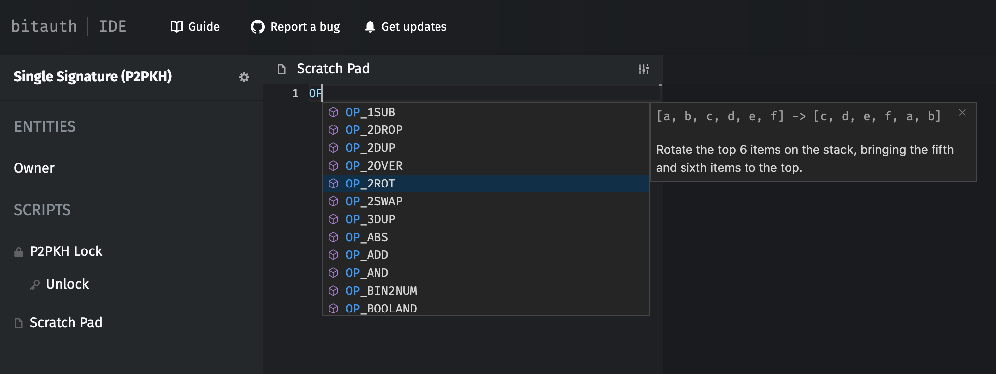 All opcodes are also autocompleted within the IDE. To read a description of a given opcode, hover over it in the editor. You can also find resources describing bitcoin opcodes online.