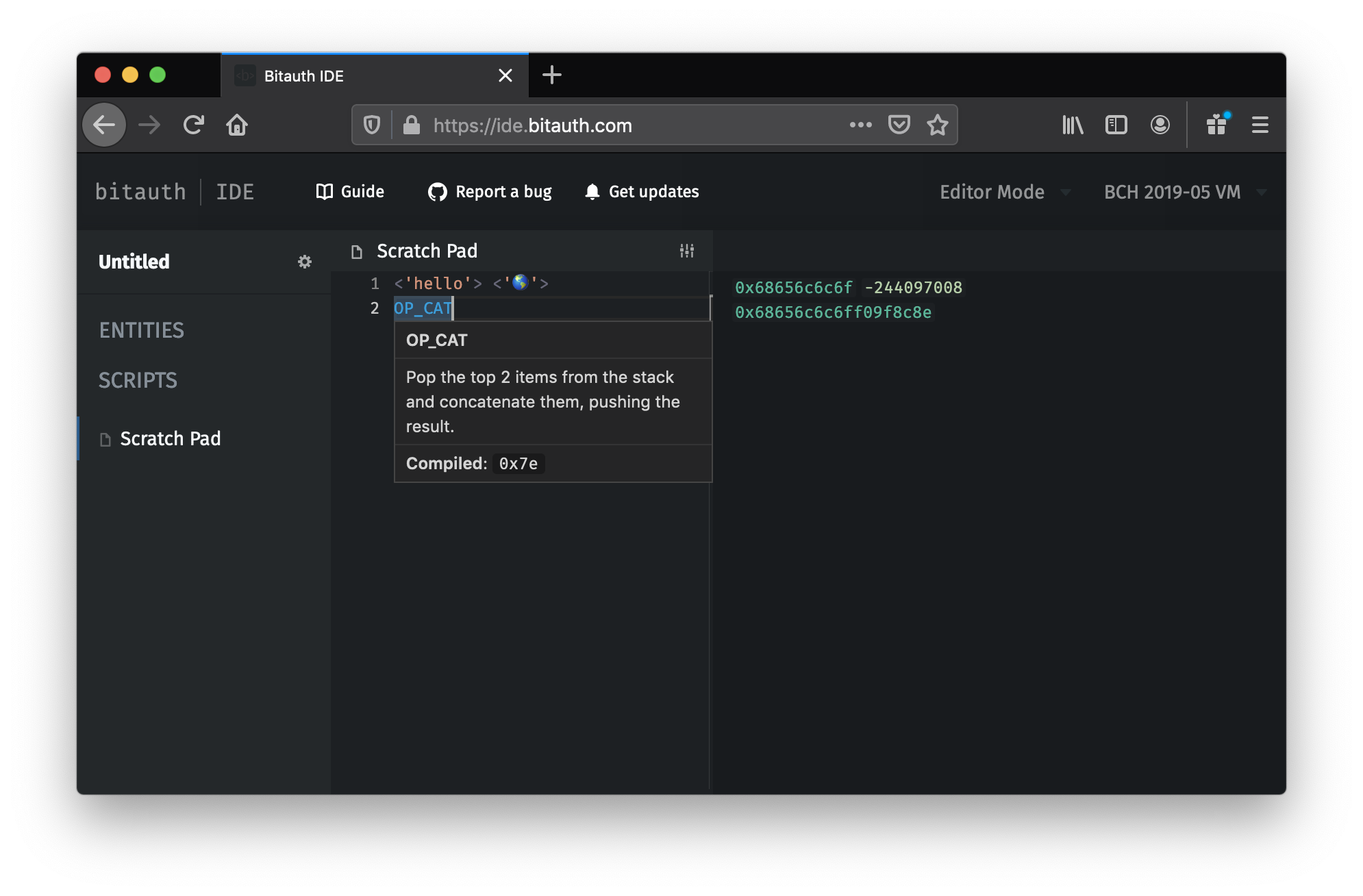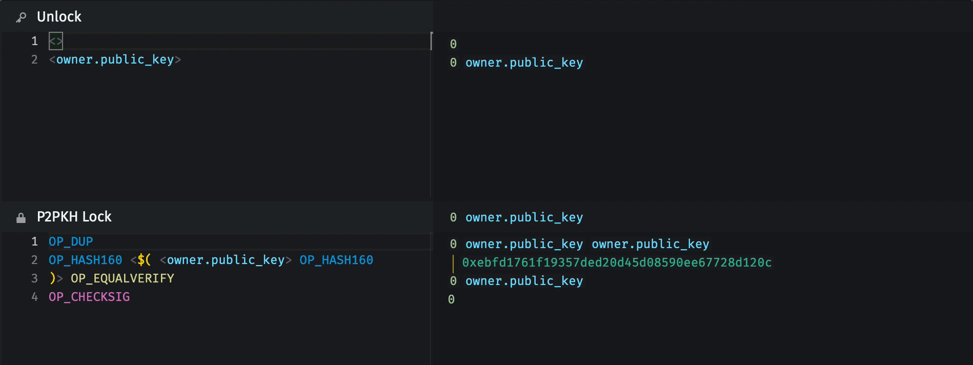 To display debugging information, Bitauth IDE transparently integrates scripts into a simple transaction and evaluates it in the bitcoin-ts virtual machine implementation.