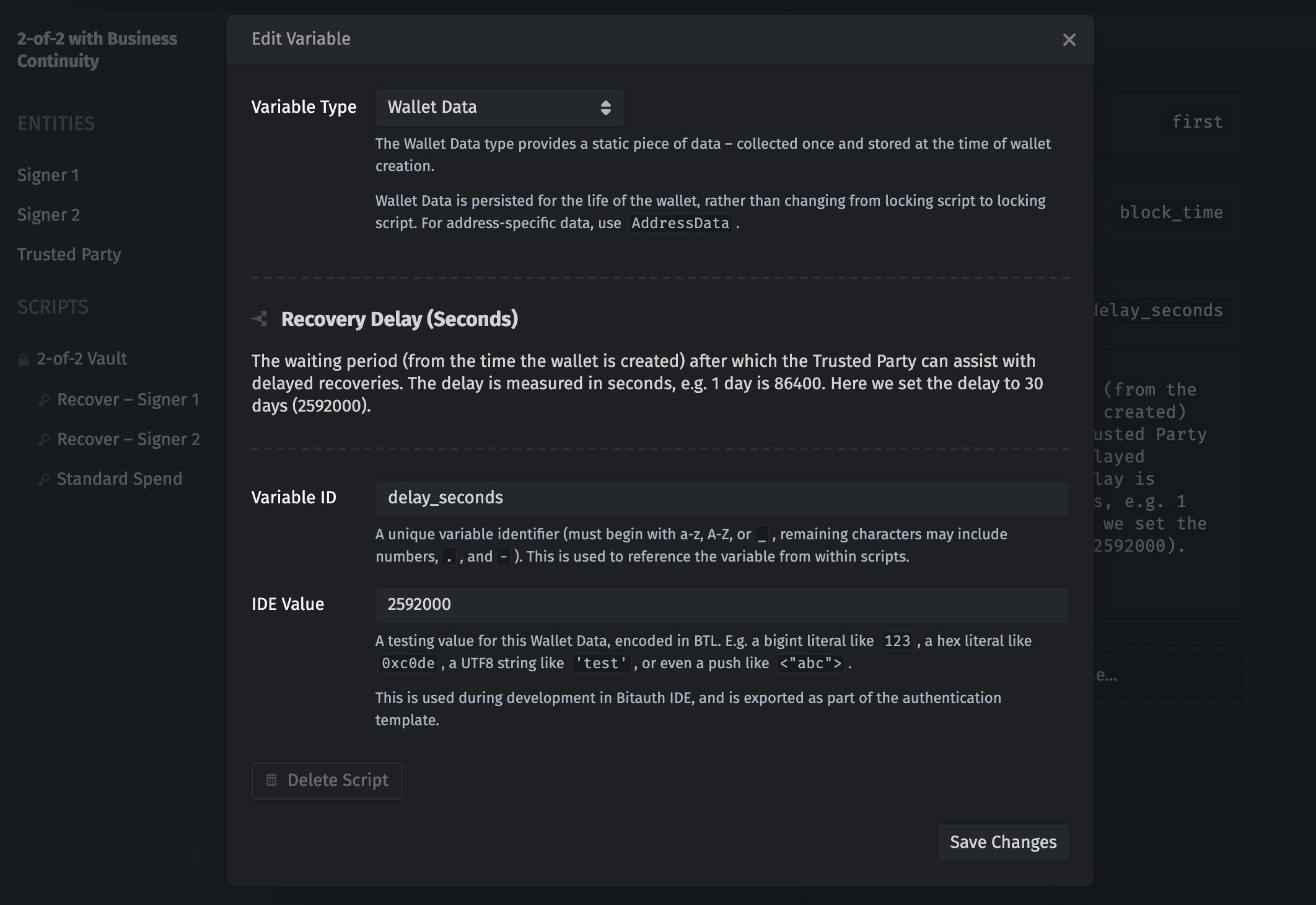 AddressData– Address Data is the most low-level variable type. It must be collected and stored each time a script is generated (usually, a locking script). Address Data can include any type of data, and can be used in any way. For more persistent data, useWalletData.CurrentBlockHeight– The Current Block Height type provides the current block height as a Script Number at the time of compilation. This is useful when computing a height forOP_CHECKLOCKTIMEVERIFY/OP_CHECKSEQUENCEVERIFYwhich is relative to the height at the moment a script is created (usually, a locking script).CurrentBlockTime– The Current Block Time type provides the current block time (at the time of compilation) as a Script Number. This is useful when computing a time forOP_CHECKLOCKTIMEVERIFY/OP_CHECKSEQUENCEVERIFYwhich is relative to the current time at the moment a script is created (usually, a locking script).HDKey– The HD Key (Hierarchical-Deterministic Key) type automatically manages key generation and mapping in a standard way. For greater control, use a Key. (NOTE: HDKey is not yet supported by Bitauth IDE.)Key– The Key type provides fine-grained control over key generation and mapping. Most templates should instead useHDKey.WalletData– The Wallet Data type provides a static piece of data – collected once and stored at the time of wallet creation. Wallet Data is persisted for the life of the wallet, rather than changing from locking script to locking script. For address-specific data, useAddressData.