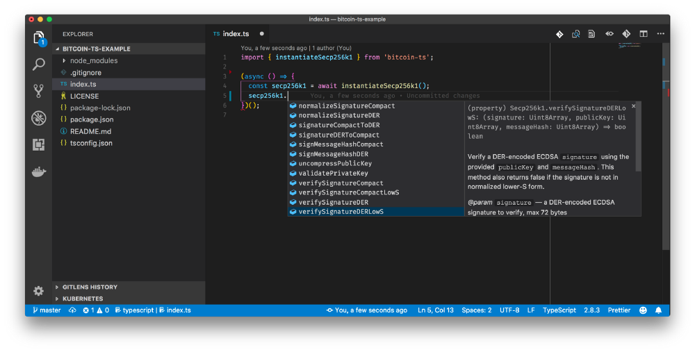 npm install --save bitcoin-tsThe API is purely-functional, fully-typed and documented with TypeScript, and accepts and returns native ES2015 typed arrays. Here’s a short example of Low-S signature verification using the library: