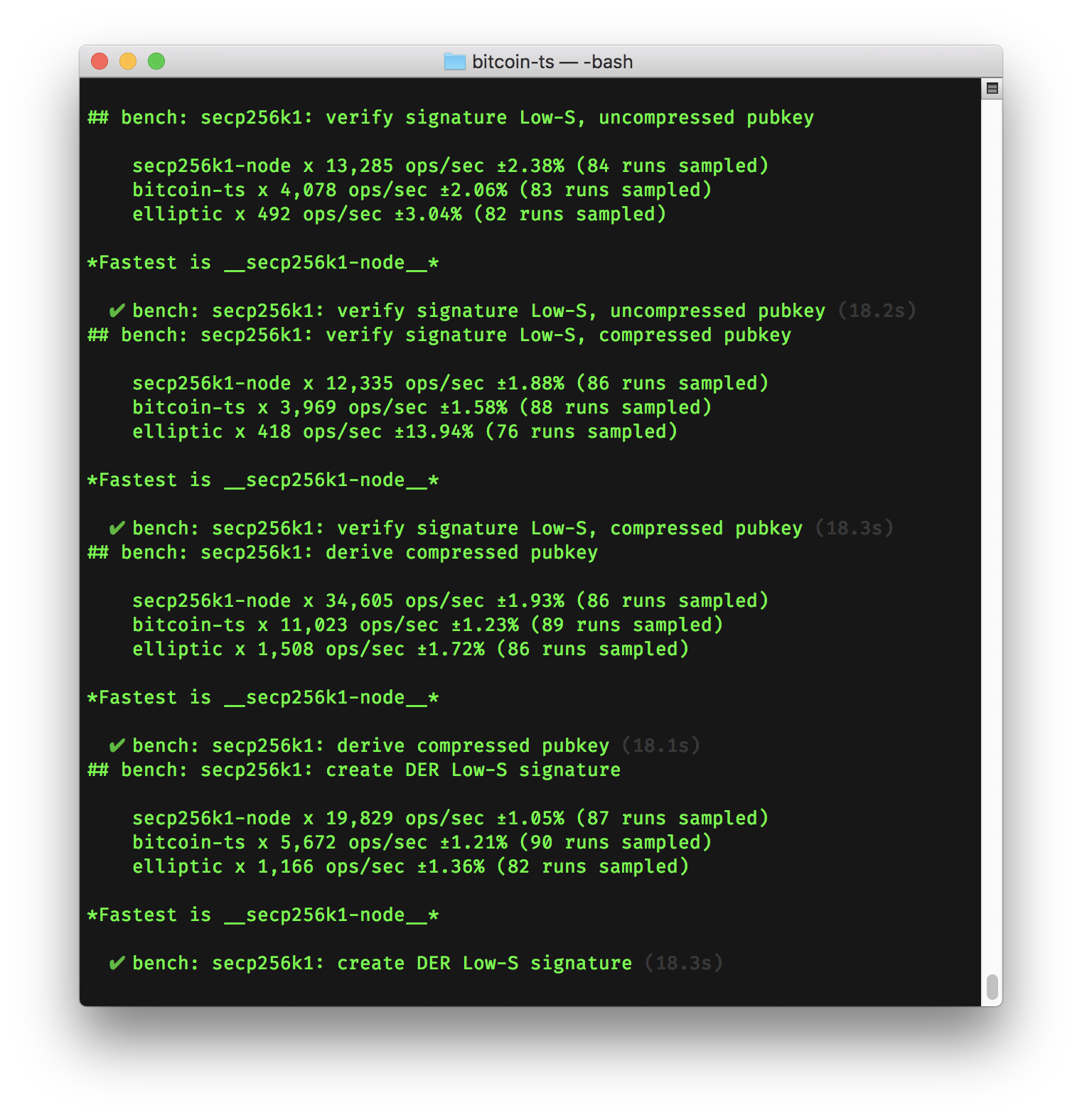 The project includes benchmarks against both elliptic and secp256k1-node. Below are the latest performance metrics.